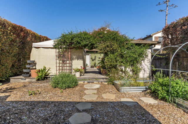 This charming 450 sq ft studio ADU offers an inviting open-plan living space with ample storage. The wood-paneled vaulted ceiling with a skylight adds warmth and natural light, creating a cozy yet spacious atmosphere. Tiled floors throughout enhance the clean, easy-to-maintain feel of the unit. The fully equipped kitchen is outfitted with stainless steel appliances, including a refrigerator, gas stove, and dishwasher, providing everything needed for convenient meal preparation. The kitchen cabinetry offers plenty of storage, and the layout flows seamlessly into the living and sleeping areas, making the space functional and welcoming.